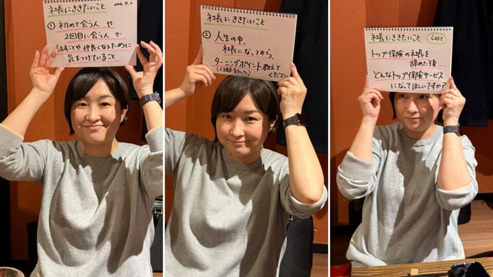 ① 初めて会う人や2回目に会う人で話すことや仲良くなるために気をつけていることは何か② 人生の中で、社長になってからの(人生が変わった)ターニングポイント教えてください③ トップ保険の辞めた後…..どんなトップ保険サービスになってほしいですか?