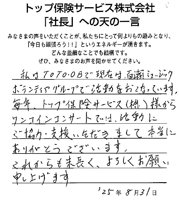 毎年、トップ保険サービス様からワンコインコンサートでは活動にご協力・支援いただきまして、本当にありがとうございます。これからも末永くよろしくお願い申し上げます。