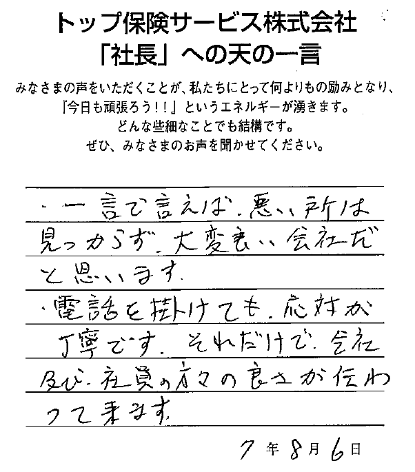 メッセージ: 一言で言えば、悪いところは見つからず、大変良い会社だと思います。 電話をかけても応対が丁寧です。それだけで会社及び社員の方々の良さが伝わってきます。