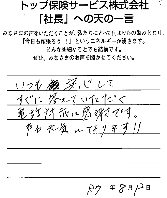 メッセージ: いつも安心してすぐに答えていただく。 電話応対に感謝です。声も元気になります!!
