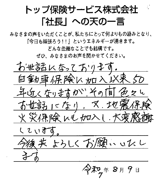 お世話になっております。自動車保険に加入以来50年近くになりますが、その間色々とお世話になり、また地震保険火災険にも加入し大変感謝しています。今後ともよろしくお願いいたします。