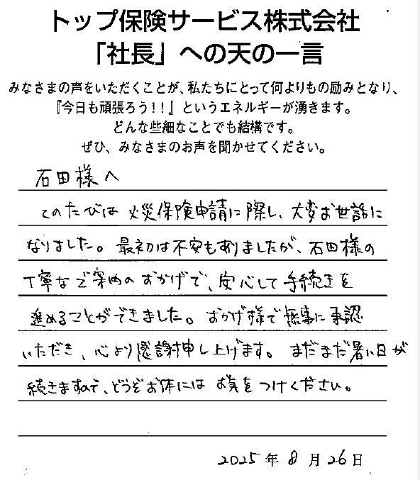 このたびは火災保険申請に際し、大変お世話になりました。最初は不安もありましたが、石田様の丁寧なご案内のおかげで、安心して手続きを進めることができました。おかげさまで無事に承認いただき、心より感謝申し上げます。まだまだ暑い日が続きますので、どうぞお体にはお気をつけください。