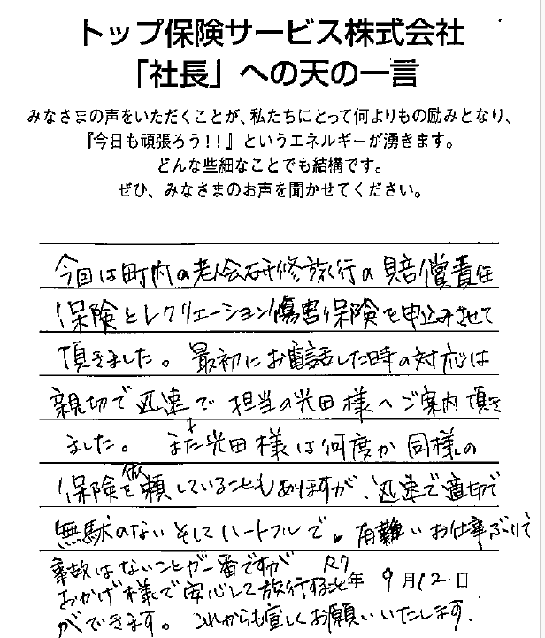 今回は町内の老人会研修旅行の賠償責任保険とレクレーション傷害保険を申し込みさせていただきました。最初にお電話したときの対応は親切で迅速で担当の光田様へご案内いただきました。また光田様は何度か同様の保険を依頼していることもありますが、迅速で適切で無駄のないそしてハートフルで ありがたいお仕事ぶりでした。事故は無いことが1番ですが、おかげさまで安心して旅行することができます。これからもよろしくお願いいたします。