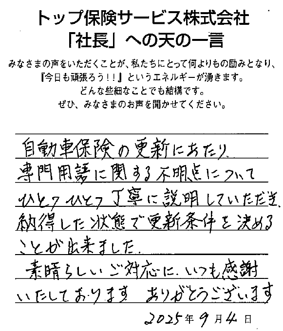 自動車保険の更新にあたり、専門用語に関する不明点について一つ一つ丁寧に説明していただき、納得した状態で更新条件を決めることができました。素晴らしいご対応にいつも感謝いたしております。ありがとうございます。