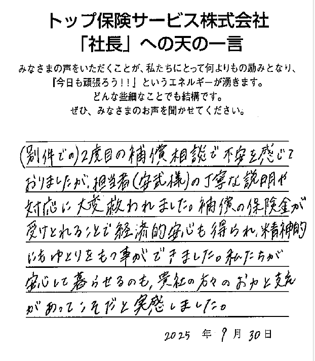 2度目の補償相談で不安を感じておりましたが、担当者安武様の丁寧な説明や対応に大変救われました。補償の保険金が受け取れることで、経済的安心も得られ、精神的にもゆとりを持つことができました。私たちが安心して暮らせるのも、貴社の方々のお力とお支えがあってこそだと実感しました。