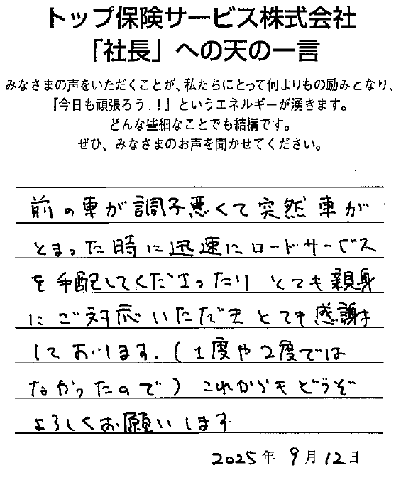 メッセージ: 前の車が調子悪くて、突然車が止まったときに迅速にロードサービスを手配してくださったり、とても親切にご対応いただきとても感謝しております。(一度2度ではなかったので)これからもどうぞよろしくお願いします。