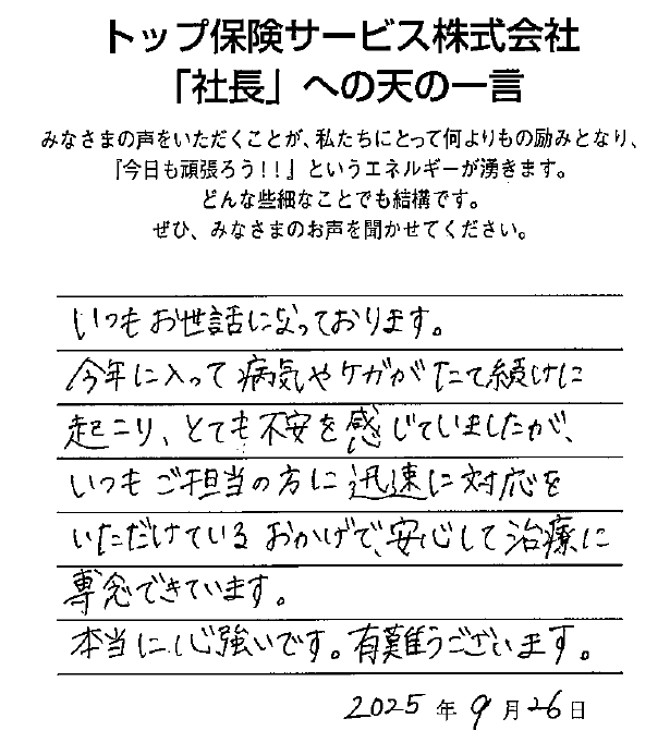 いつもお世話になっております。今年に入って病気や怪我が立て続けに起こり、とても不安を感じていましたが、いつもご担当の方に迅速に対応していただけているおかげで、安心して治療に専念できています。本当に心強いです。ありがとうございます。