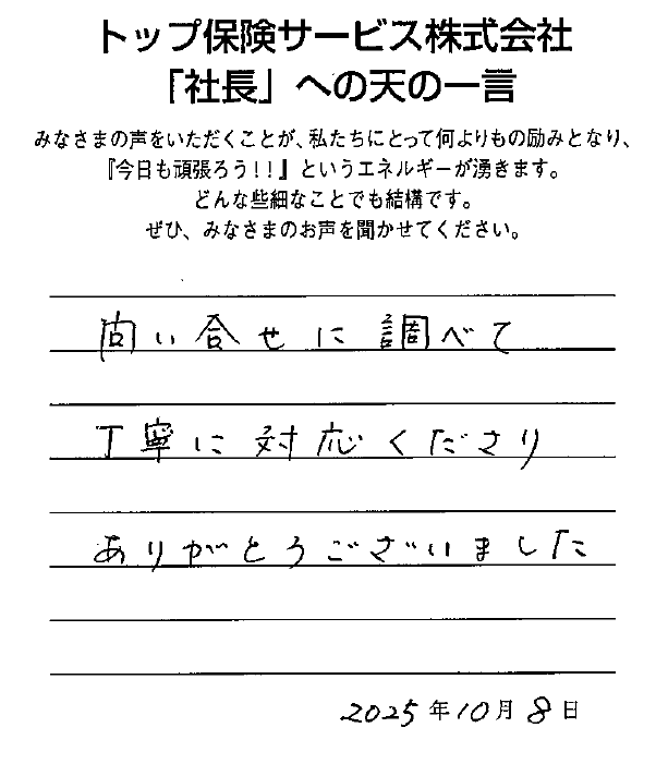 メッセージ: 問合せに調べて丁寧に対応くださりありがとうございました。
