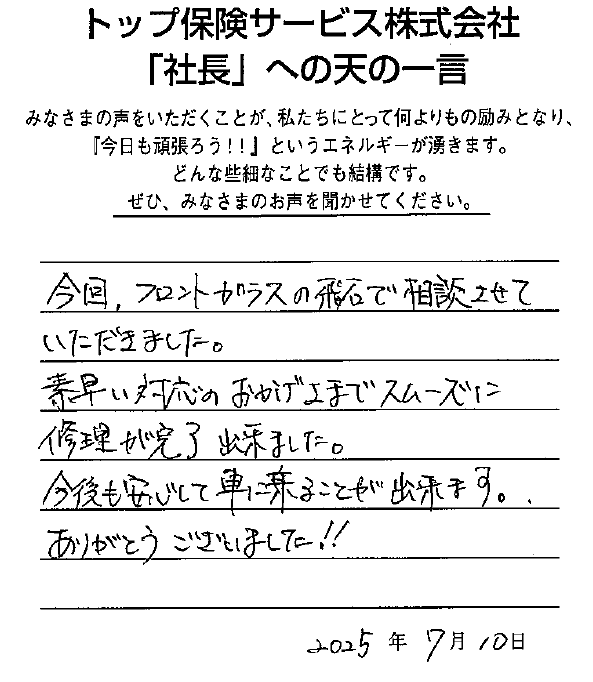 メッセージ: 今回フロントガラスの飛び石で相談させていただきました。素早い対応のおかげさまでスムーズに修理が完了できました。今後も安心して車に乗ることができます。ありがとうございました!!