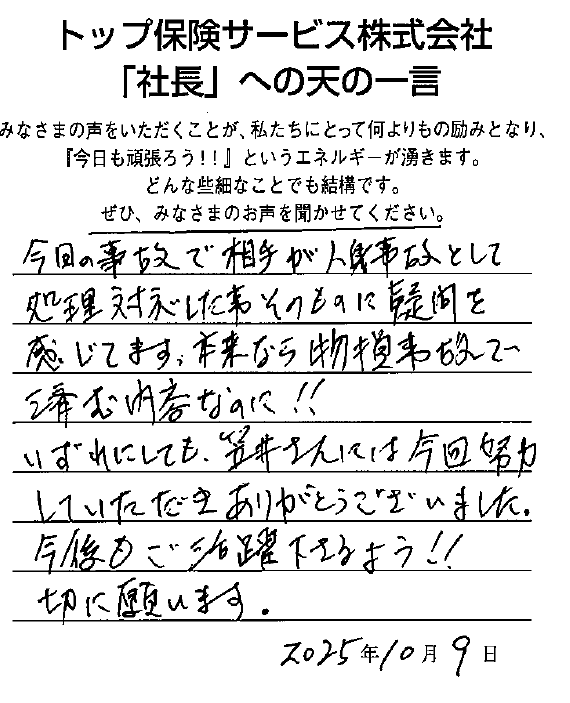 メッセージ: いつも迅速で丁寧な対応をありがとうございます!おかげさまで、不安なく保険金請求をすることができました!本当にありがとうございます。
