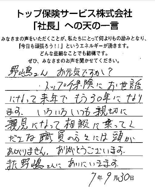 メッセージ: 野嶋さんお元気ですか?トップ保険にお世話になって、来年でもう30年になります。いろいろいつも親切に親身になって相談に乗ってくださる。職員の方々には頭が上がりません。ありがとうございます。また野嶋さんに会いに…