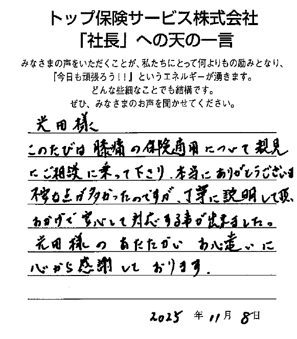 このたびは膝痛の保険適用について、親身にご相談に乗ってくださり本当にありがとうございました。不安な点が多かったのですが、丁寧に説明していただいたおかげで安心して対応することができました。光田様の温かいお心遣いに心から感謝しております。