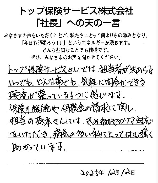 保険の継続や保険金の請求に関し、担当の森本さんにはきめ細やかな対応をいただき、病気の多い私にとっては心強く助かっています。