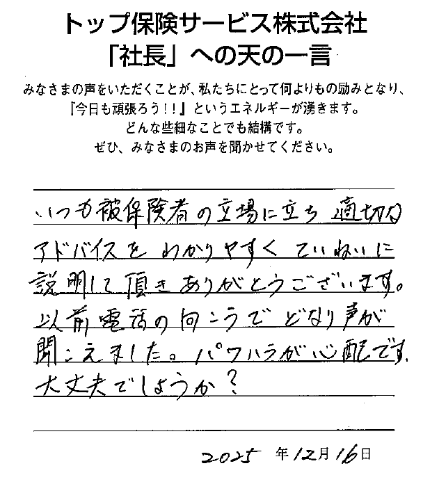 メッセージ: いつも被保険者の立場に立ち、適切なアドバイスをわかりやすく丁寧に説明していただきありがとうございます。以前電話の向こうで怒鳴り声が聞こえました。パワハラが心配です。大丈夫でしょうか?