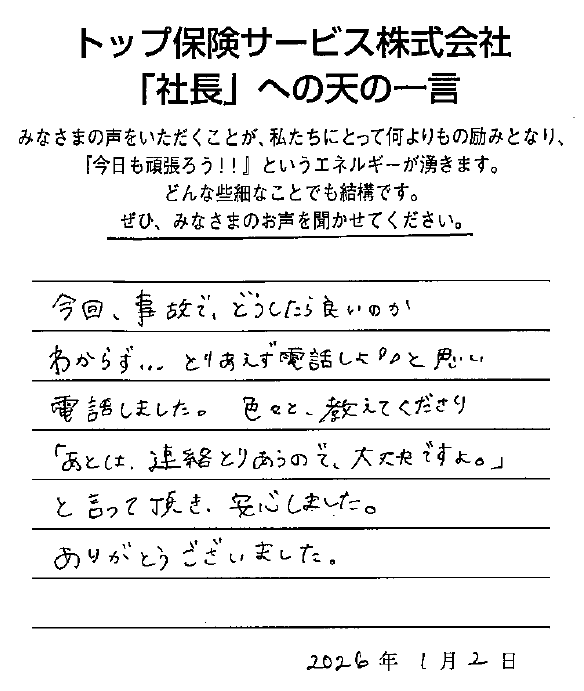 メッセージ: 12月に入り、息子の運転する車が物損事故を起こしたり、後ろから追突されたりと立て続けに貴社にお世話になりました。いずれも大事には至らず、胸を撫で下ろしているところですが、いざと言う時に貴社のバックアップがあ…