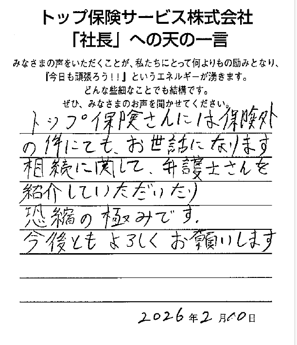 トップ保険さんには保険外の件にてもお世話になります。相続に関して、弁護士さんを紹介していただいたり、恐縮の極みです。今後ともよろしくお願いします。