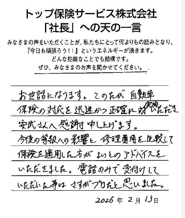 お世話になります。このたび自動車保険の対応を迅速活性確認実施いただき、安武さんへ感謝申し上げます。今後の等級への影響と修理費用を比較して保険を適用した方が良いとのアドバイスをいただきました。電話のみで受付していただいた時は、さすがプロだと思いました。