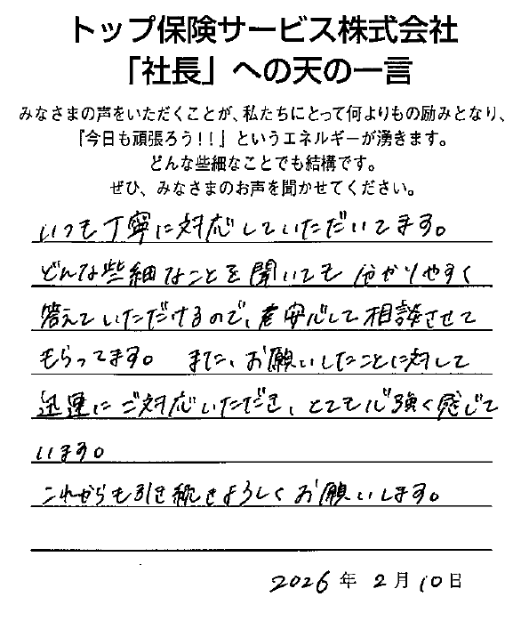いつも丁寧に対応していただいています。どんな些細なことを聞いてもわかりやすく答えていただけるので、安心して相談させてもらってます。またお願いしたことに対して迅速にご対応いただき、とても心強く感じています。これからも引き続きよろしくお願いします。