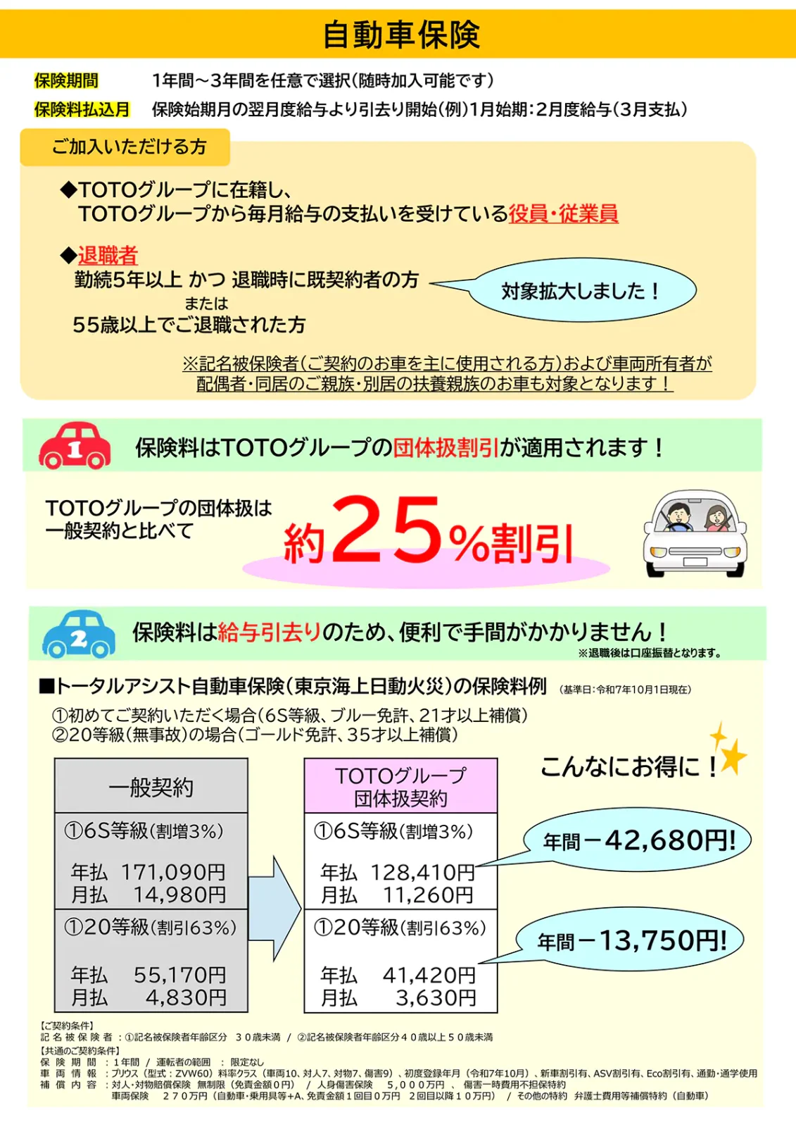 本制度は、TOTO株式会社およびTOTOグループ会社の従業員とその家族、退職者とその家族の方のみが加入できるTOTOグループ専用の「損害保険」として、2010年1月1日に発足いたしました。