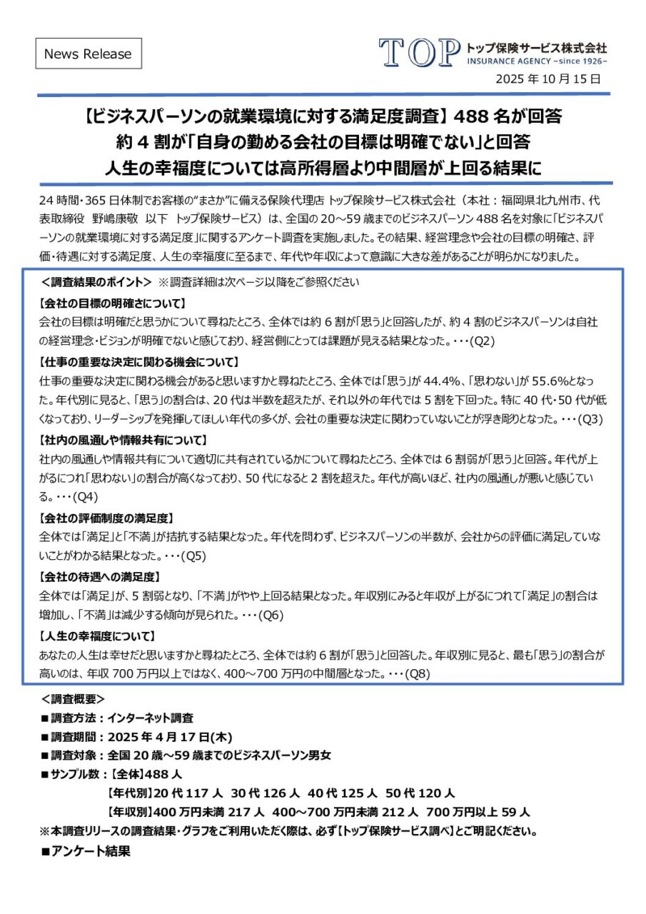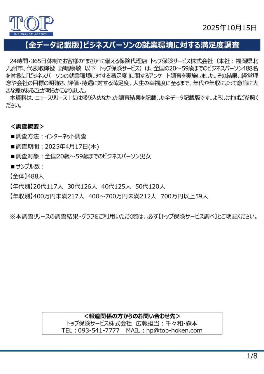 【全データ記載版PDF】ビジネスパーソンの就業環境に対する満足度調査(トップ保険サービス)
